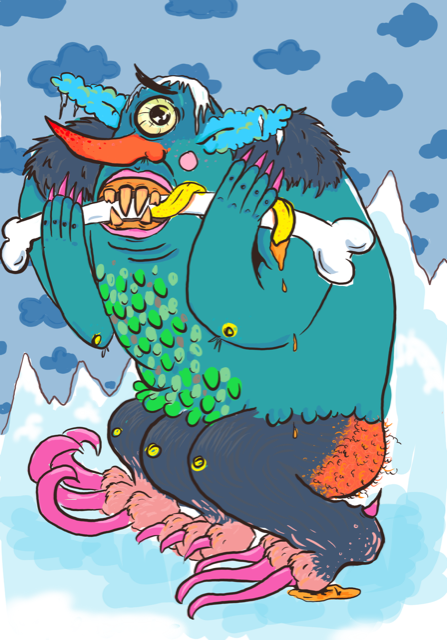 HEAD: APRICOT JAM, COVERED IN LOTS OF EYES, FURRY TRIANGLE NOSE, AND RATTLESNAKE TONGUE.